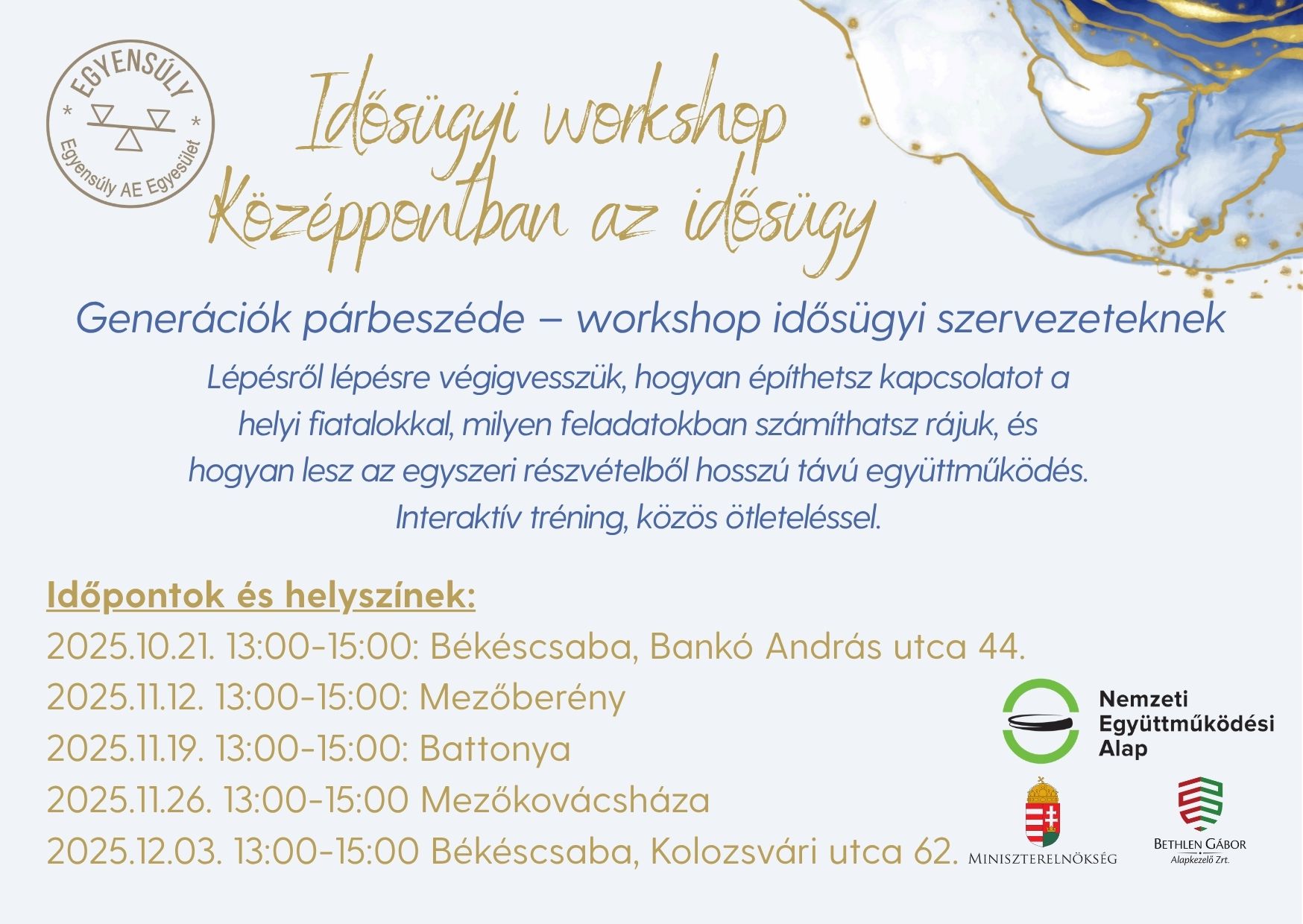 Az Egyensúly AE Egyesület idősügyi műhelysorozatot szervez, ahol az idősekkel foglalkozó szervezetek lépésről lépésre ismerhetik meg, hogyan építhetnek kapcsolatot a helyi fiatalokkal, milyen közös feladatokra számíthatnak, és hogyan válhat az egyszeri részvételből hosszú távú együttműködés.